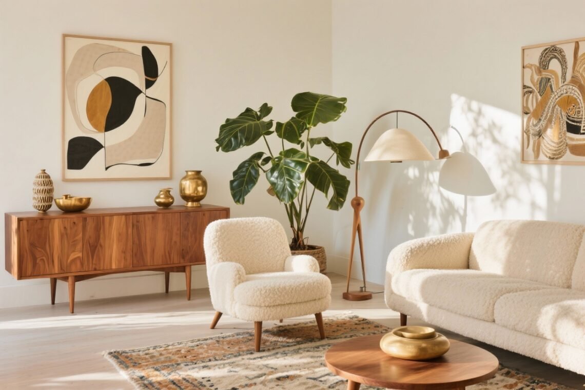 Keep your midcentury anchors—sofa, credenza, iconic armchair—and layer in the Anthro details. The formula is simple: clean lines + tactile layers + artful color + handmade accents. Edit ruthlessly so every piece earns its spot.