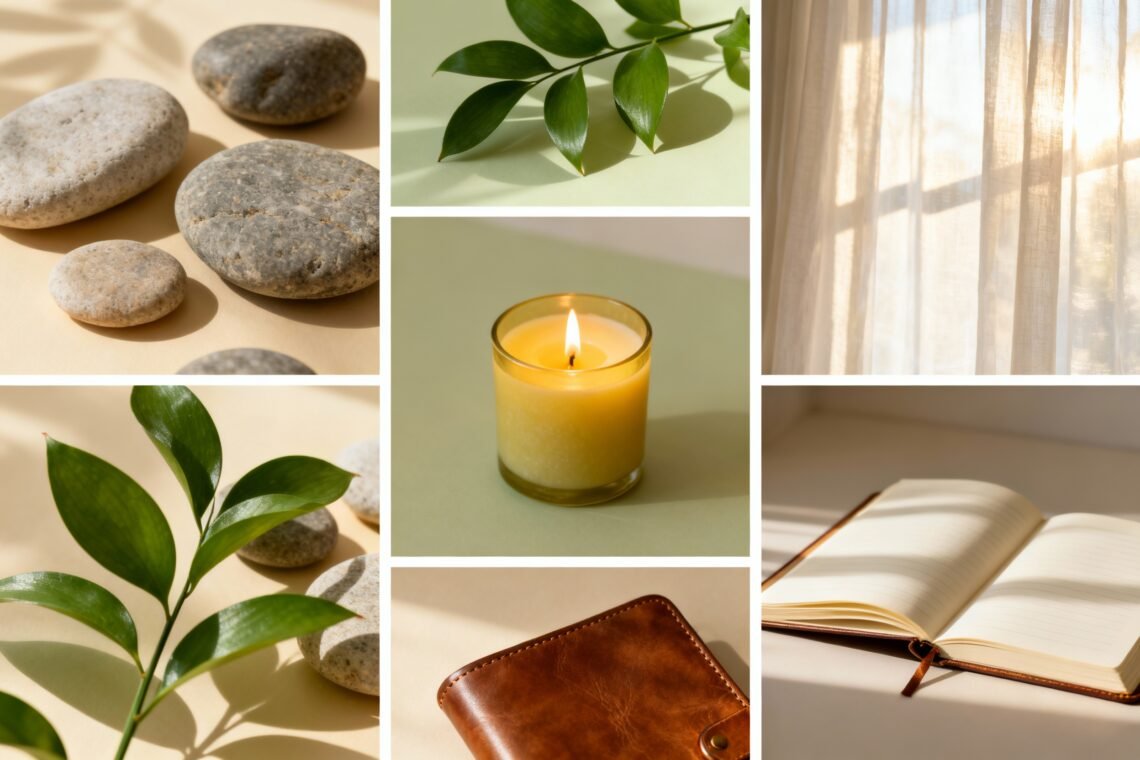 - Texture: Use kraft paper, linen scraps, or a pressed leaf for tactile calm.