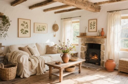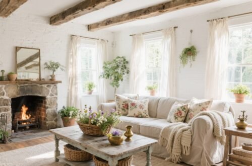 Greenery makes the whole room exhale. A potted fern, trailing ivy on a shelf, or a vase of wildflowers—even dried ones—pulls the cottage feel together.