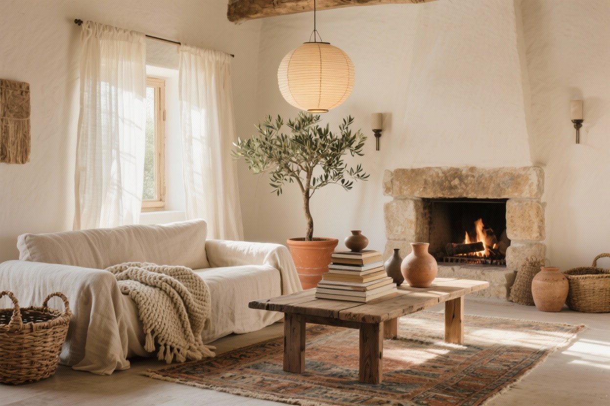 - Jute rug + linen curtains + wool throw for earthy softness