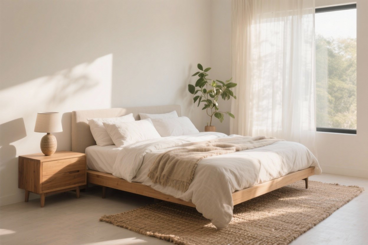 Your bed is the main character. Keep the silhouette simple—low profile, rounded corners, or a soft upholstered headboard. It whispers “calm,” not “conference room.”