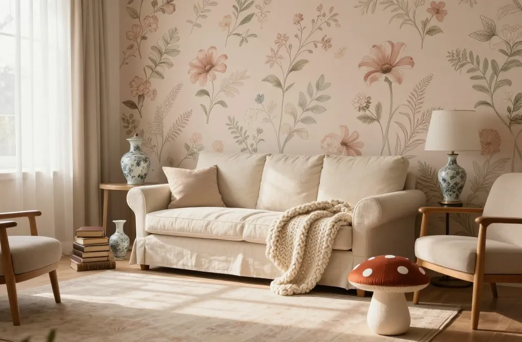 • Walls: Pale blush or sage green with a large-scale floral wallpaper accent wall