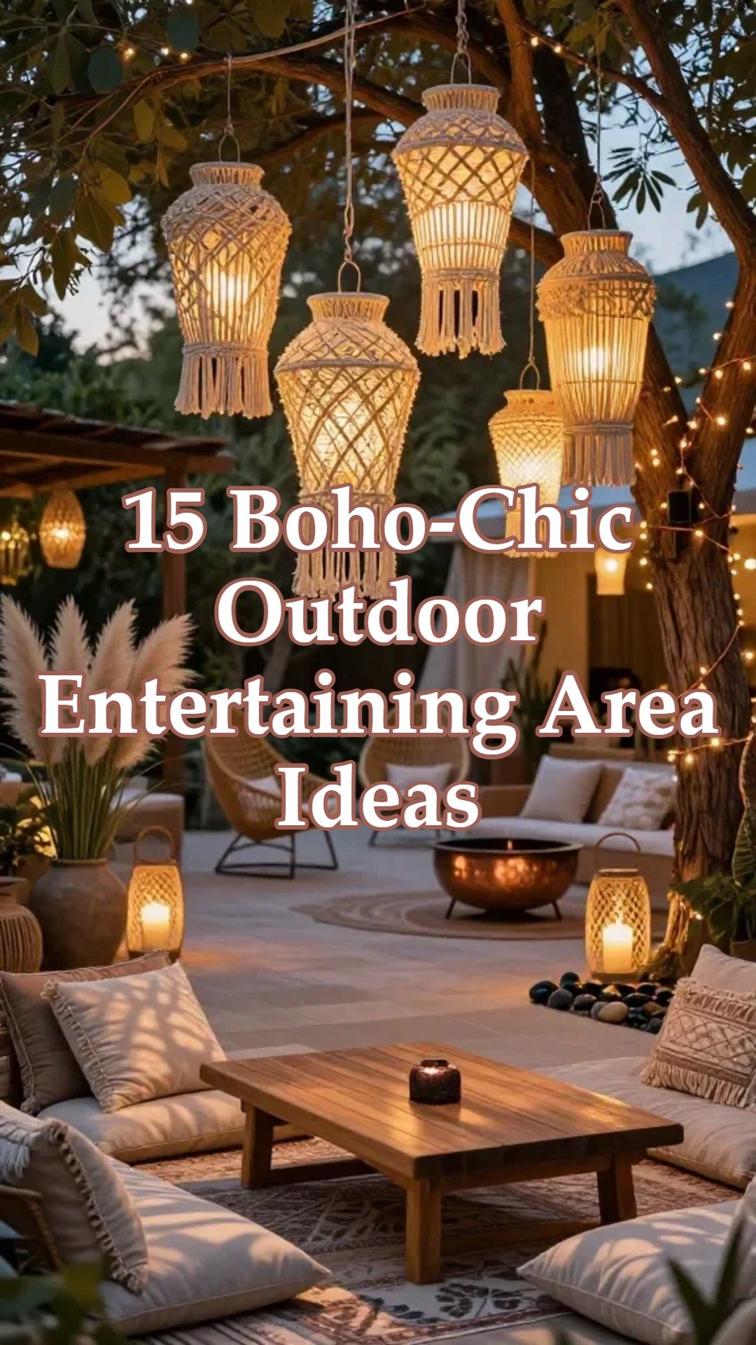 15 Boho-Chic Entertaining Area Concepts Starting with a Low-Profile Teak Coffee Table for Floor Seating, Followed by a Set of Multi-Colored Patterned Polypropylene Rugs, Solar Powered Macrame-Look Resin Lanterns, a Pair of Woven Polyethylene Egg Chairs with Steel Stands, Uv-Rated Faux Pampas Grass in Oversized Heavy Vases, a Portable Hammered Copper Fire Pit, a Set of Tassel-Trimmed Sunbrella Throw Pillows, a Faux-Wicker Serving Caddy, a Set of Solar Powered Copper Wire Fairy Lights Wrapped Around Tree Trunks, a Weighted Base Sun Sail in a Sand Color, a Set of Decorative Resin "River Rock" Floor Accents, a Weather-Proof Outdoor Radio in a Retro Design, a Set of Solar Powered Flower-Shaped Stake Lights, a Weighted Resin Buddha Statue, and a Set of Heavy-Duty Canvas Privacy Drapes.
