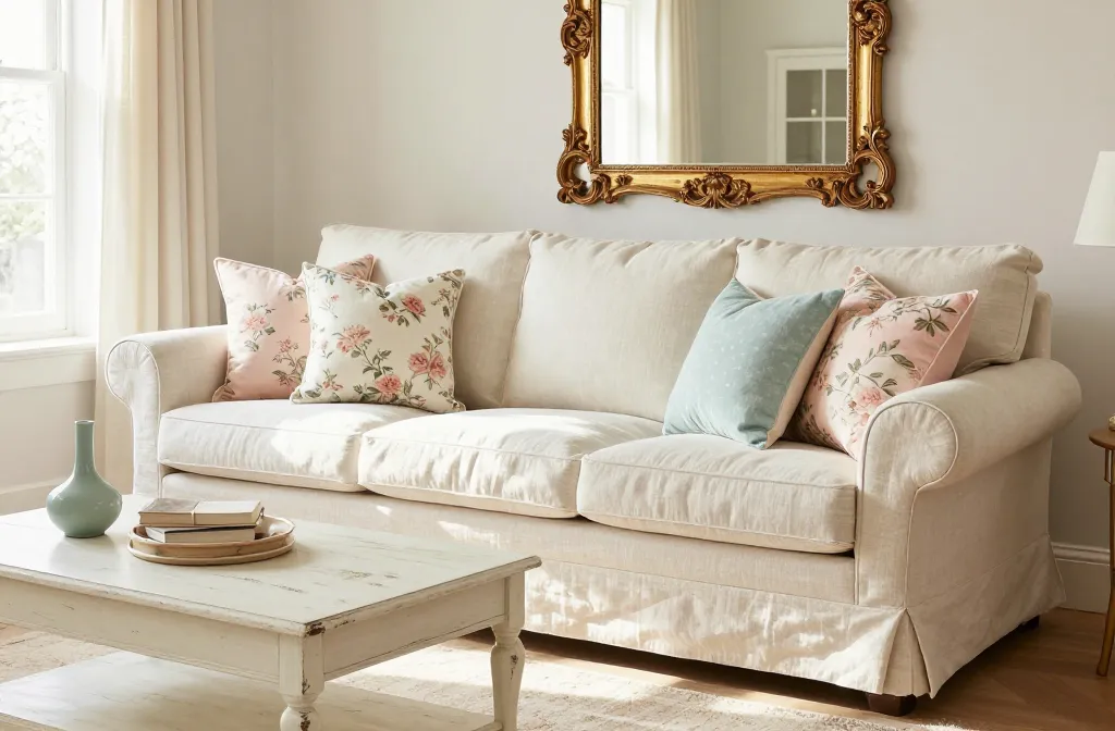 • A plush, oversized linen sofa with rolled arms, adorned with throw pillows in floral toile patterns.