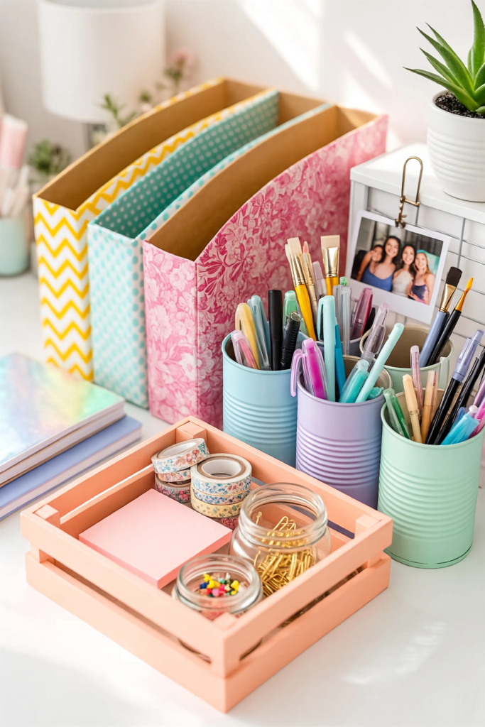 A messy desk equals a messy mind, right? Keep your workspace organized and stylish with a personalized desk caddy. This is another fantastic way to upcycle everyday items into something super functional and cute.