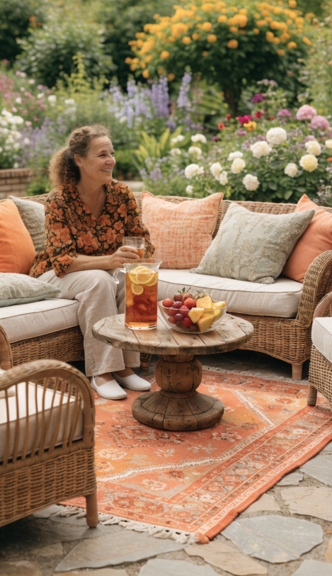 - Lay down a colorful or patterned outdoor-friendly rug.