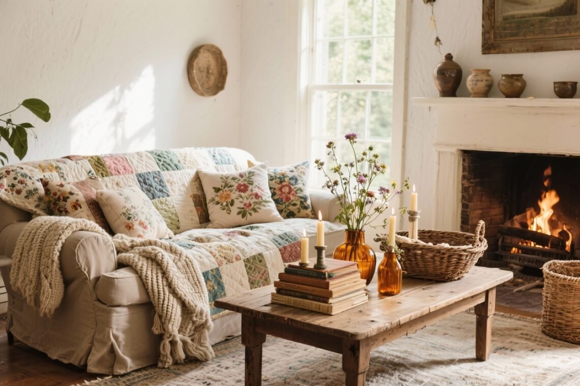 Bring in a vintage camelback sofa covered in slipcovers, then scatter embroidered pillows from estate sales. Cluster brass candleholders on the mantel, drape an heirloom quilt over the sofa arm, and lean an antique mirror to bounce the glow. Every evening feels like a holiday.
