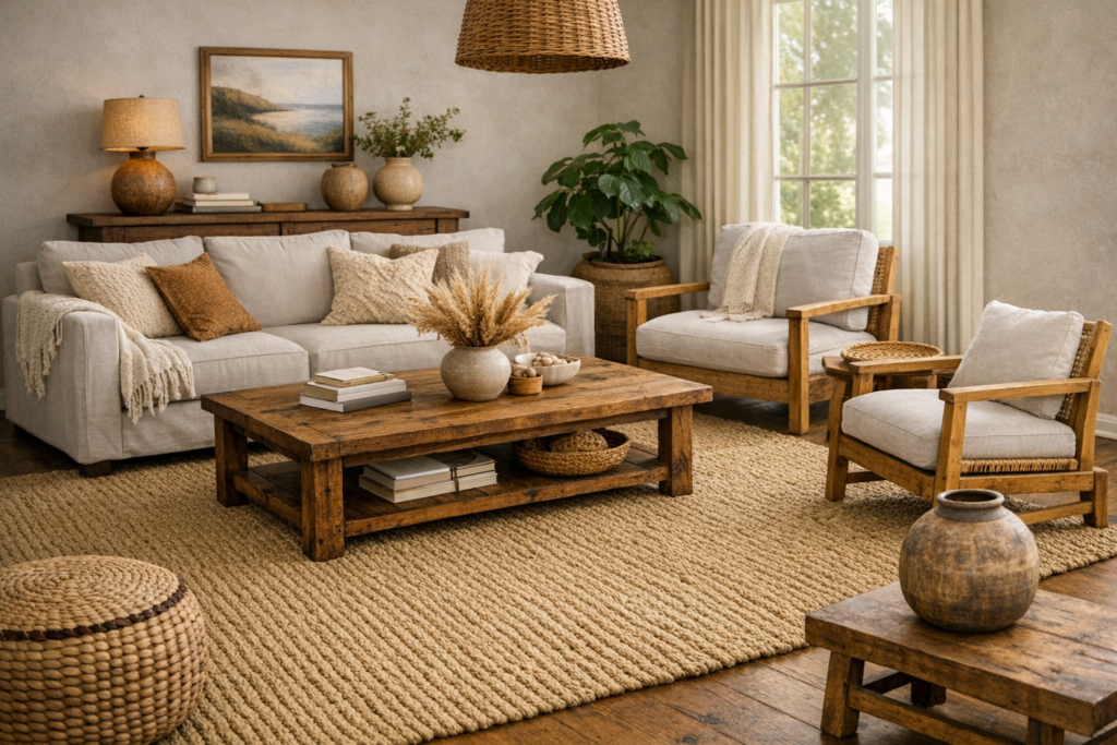 The living room is where a coastal aesthetic either holds or falls apart. It needs a material layer — something underfoot, something to rest in, something overhead — that immediately communicates texture and warmth. Before a single piece of art or candle goes on a shelf, this foundational layer does the quiet, essential work of making the space feel rooted and real.