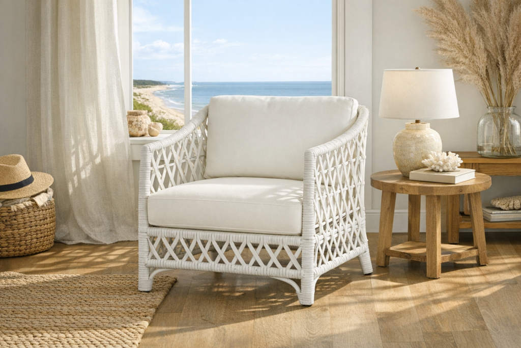 Every coastal living room needs one piece of furniture that whispers “this room breathes.” A well-chosen rattan or wicker accent chair does exactly that — it adds structure without weight, personality without loudness, and natural texture without competing with everything else in the space.