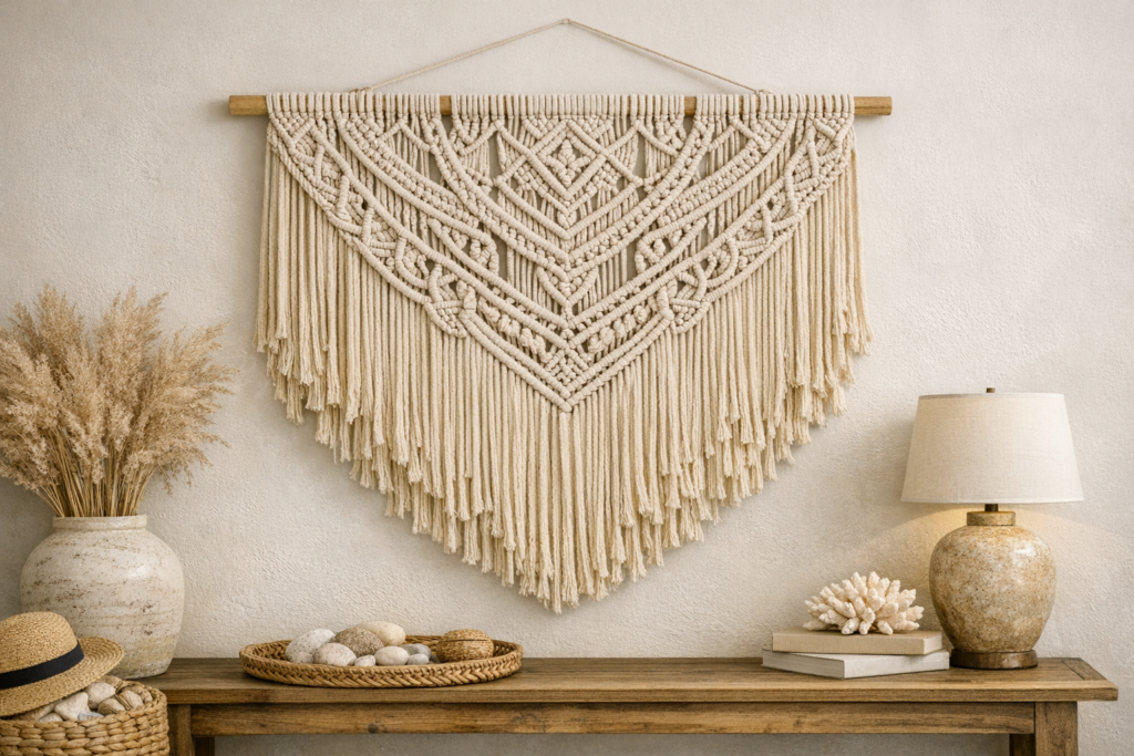 4. Small Cotton Macramé Wall Decor A smaller macramé piece works perfectly in spaces where a large tapestry would overwhelm: above a nightstand, in a bathroom, in a hallway nook. This classic geometric design in cream cotton brings artisanal warmth to any blank wall without demanding attention.