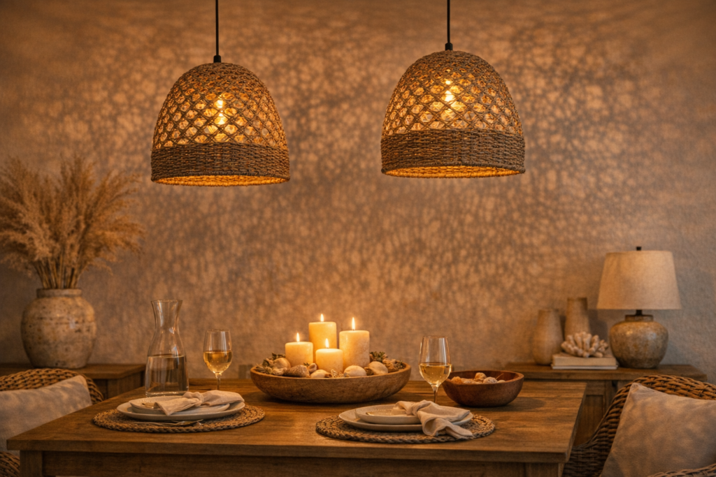 Lighting is where most coastal interiors fall flat — the fixture is often the last thing someone thinks about, when it should be one of the first. A woven seagrass or rattan pendant light does double duty: it provides warm, diffused illumination through the natural fibers (creating that gorgeous, dappled amber glow on the ceiling and walls) while also functioning as a sculptural object in its own right.