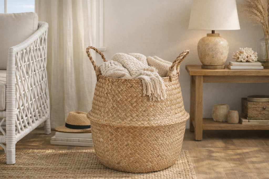 The seagrass belly basket is perhaps the most versatile coastal piece you can buy. It holds a fiddle leaf fig or snake plant without a visible plastic pot in sight. It corrals throw blankets in the corner of a living room. It stores magazines, towels, kids’ toys — and it looks intentional doing all of it. The round, organic form of the belly basket has an almost ancient quality; it communicates “this home uses natural materials” at a glance.
