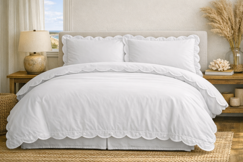 This OEKO-TEX certified 100% cotton duvet cover set earns its place here not just for the color (that quiet, clean white) but for the scalloped edge detail — those gentle wave-shaped scallops at the border feel referential to the coast without being literal about it. The button closures keep the insert neatly in place, and the set includes two standard shams, which means you can make the bed look completely pulled-together with minimal effort. Press it once out of the dryer for the best effect; intentional wrinkles are fine, but crisp scallop edges make the design sing.