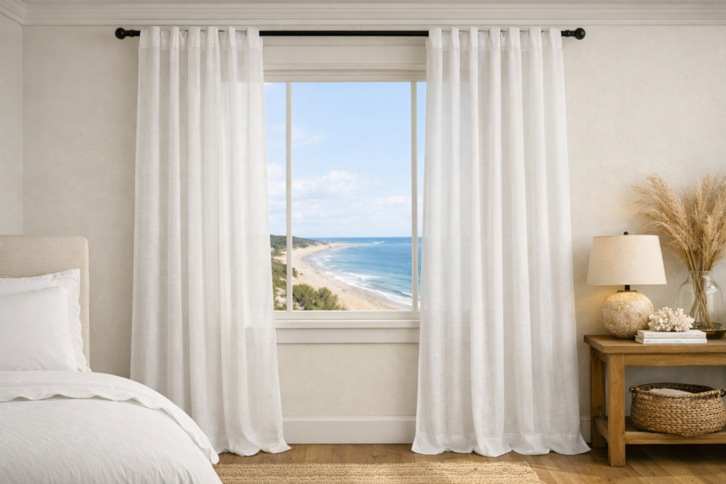 Nothing communicates coastal more immediately than the way light moves through a room. Sheer linen curtains filter sunlight into something soft and directional — not blinding, not gloomy, but luminous. They billow with air movement. They turn an ordinary window into a scene. They’re one of the lowest-cost, highest-impact changes you can make to a bedroom or living room.