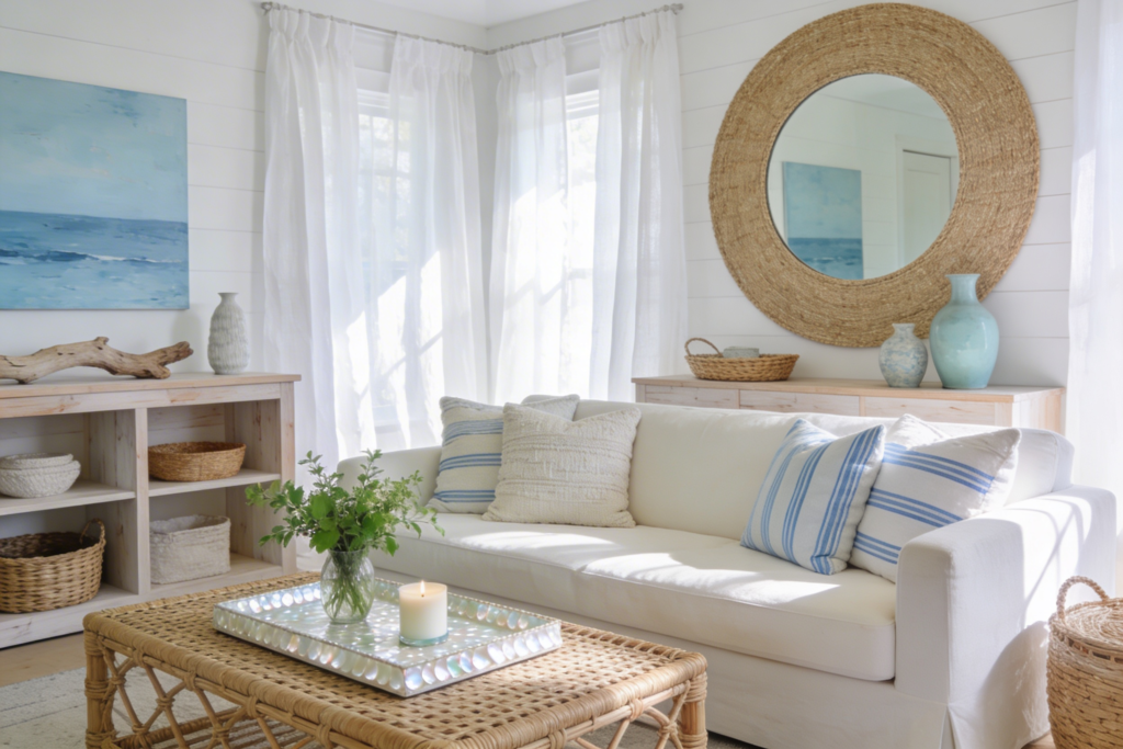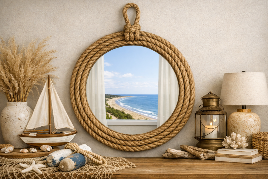 Mirrors are one of the most underused tools in coastal design. A round mirror with a natural rope or jute frame bounces light deeper into a room, creates a sense of expanded space, and adds another layer of organic texture without requiring art-level commitment. It’s also one of the most versatile pieces you can hang — it works in the entryway, above a dresser, or leaned against a wall in the bedroom corner.