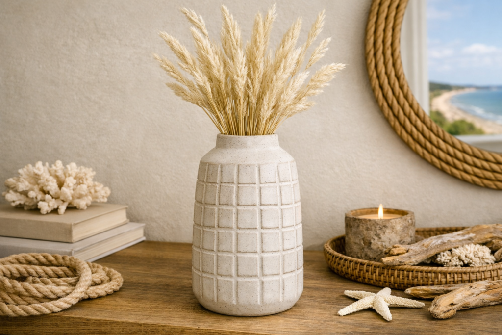 A single well-chosen ceramic vase on a bedside table or dresser does something remarkable: it brings the eye down, creates a focal point that doesn’t demand attention, and gives you a place to put a branch of dried eucalyptus or a few stems of pampas grass. In a coastal bedroom, white or pale ceramic with a slightly matte, handmade texture is the right call — it reads as natural and considered without being overly decorative.