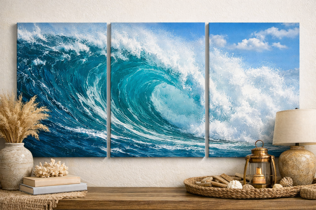The one piece of representational coastal art in this lineup — and it earns its place because of how it’s rendered. A three-panel ocean wave canvas, when chosen carefully, doesn’t read as theme-park décor. It reads as atmosphere: blue, white, moving, alive. It’s the piece that makes someone walk into the bedroom and exhale.