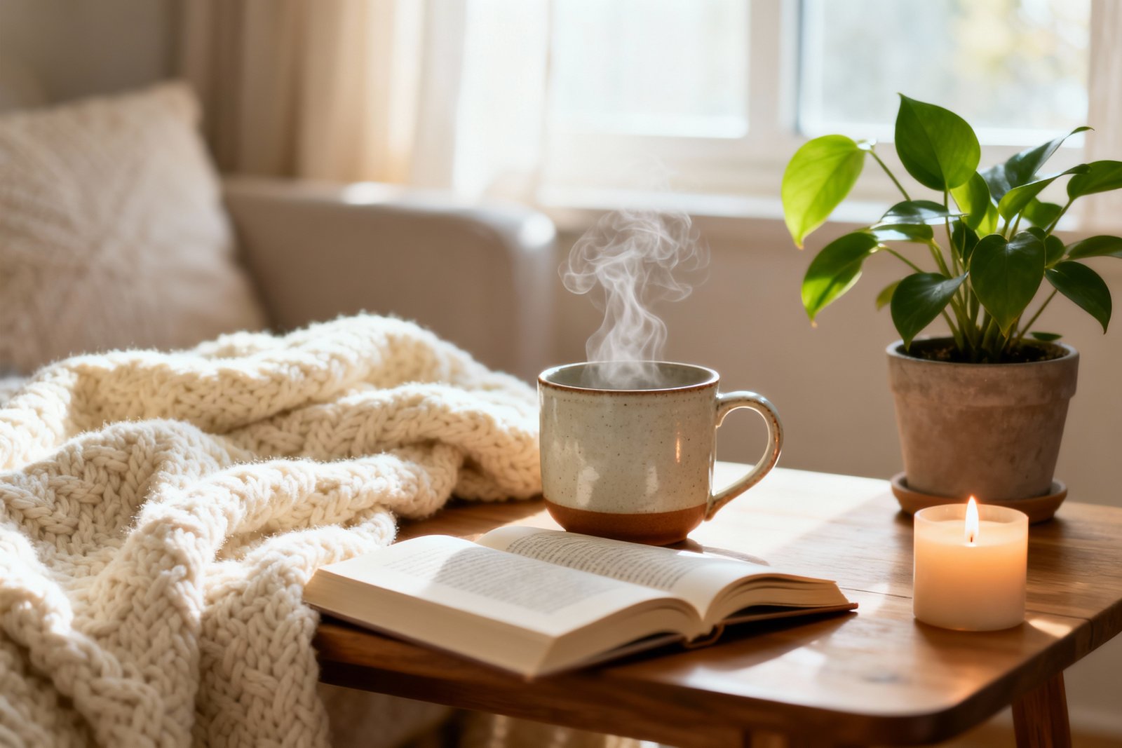 A cheap candle, a mug you already love, and a book you own beat a $60 candle you never light. Use what you have and make it intentional.