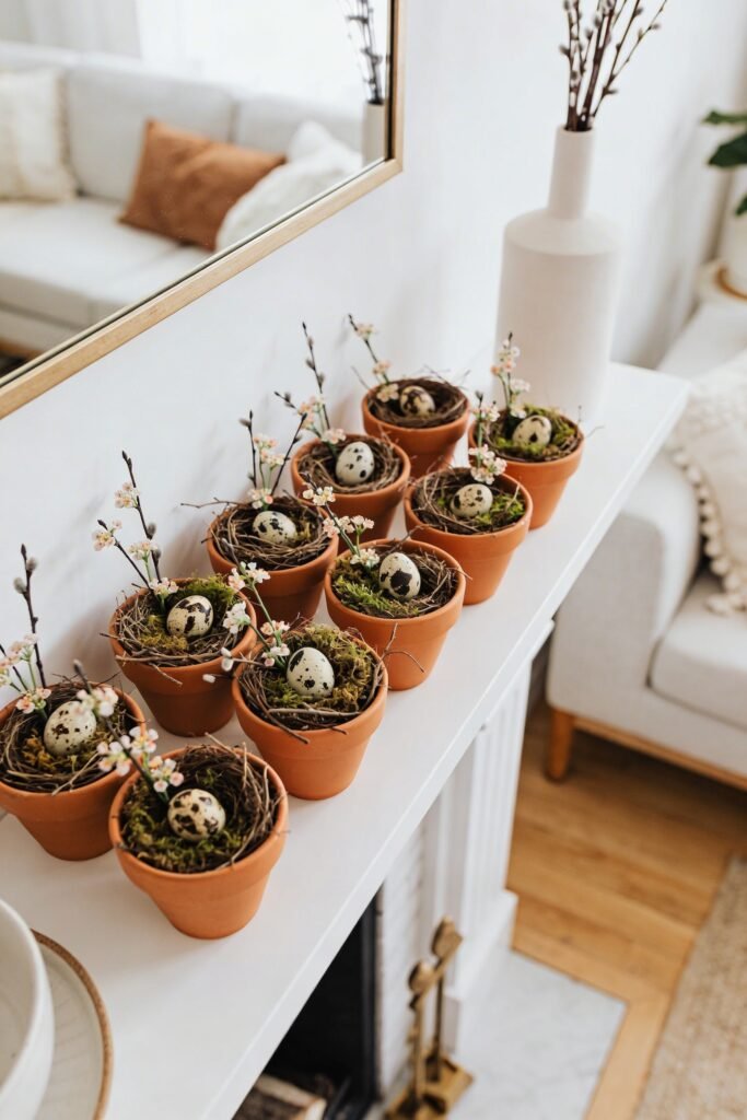 Forget the bright green plastic grass. We’re bringing nature indoors with small, elegant terracotta pot nests. These miniature vignettes are perfect for adding organic texture and a touch of rustic charm to your mantle. They’re earthy, understated, and look incredibly intentional.