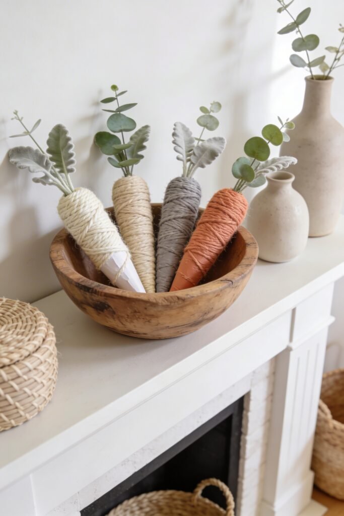 Hold on, hear me out. Yarn-wrapped carrots might sound like something from a kindergarten craft fair, but we’re elevating them to chic mantle decor status. The key? Neutral, high-quality yarn and minimalist faux greenery. Think texture, not cartoon.