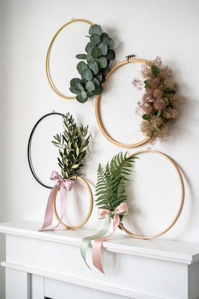 3. Attach Your Botanicals: Using floral wire or hot glue, attach small clusters of greenery to one section of the hoop. You can cover a quarter, a third, or even just a small sprig at the bottom. The key is to keep it sparse and intentional.