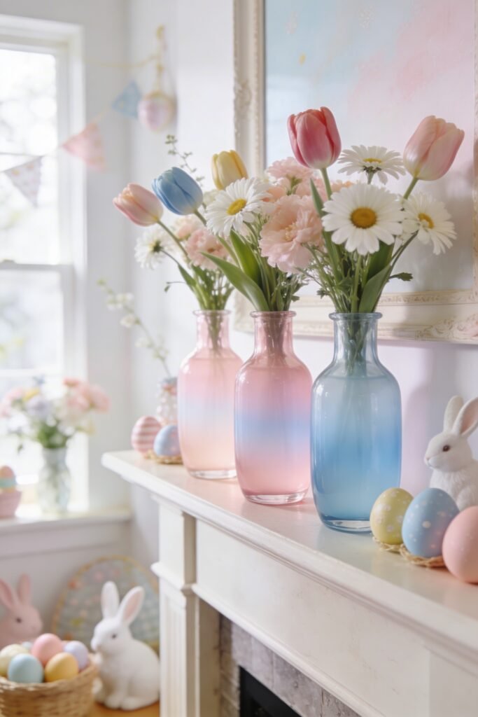 Color, but make it subtle. Ombre is still very much in style, and applying this technique to simple glass vases creates a stunning, custom look perfect for spring. These vases will beautifully hold your fresh-cut flowers, adding a sophisticated pop of color to your mantle.
