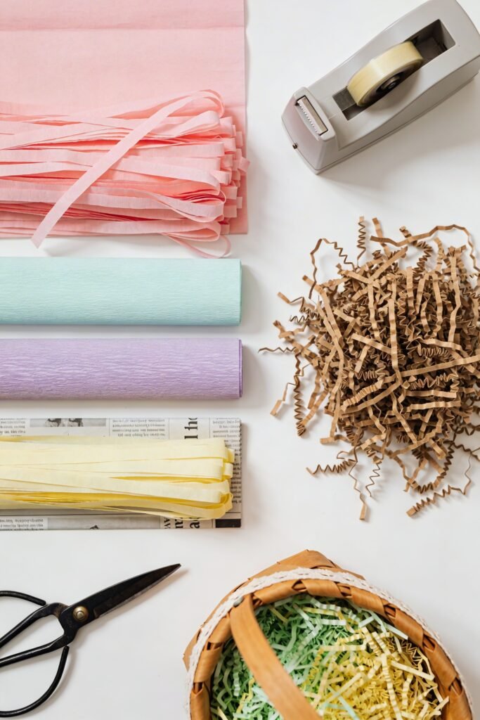 - Materials: Tissue paper (various pastel colors), old newspapers or magazines, scissors or paper shredder.