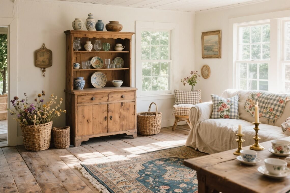 The vintage hutch is the MVP of cottage storage. It keeps dishes dust-free while letting your prettiest pieces shine. Glass doors make even chipped mugs look intentional (and cute, IMO).