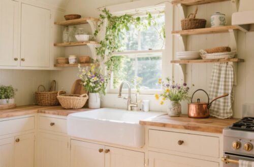 - Backsplash: Try beadboard, subway tile, or tiny floral tiles for instant cottage vibes.