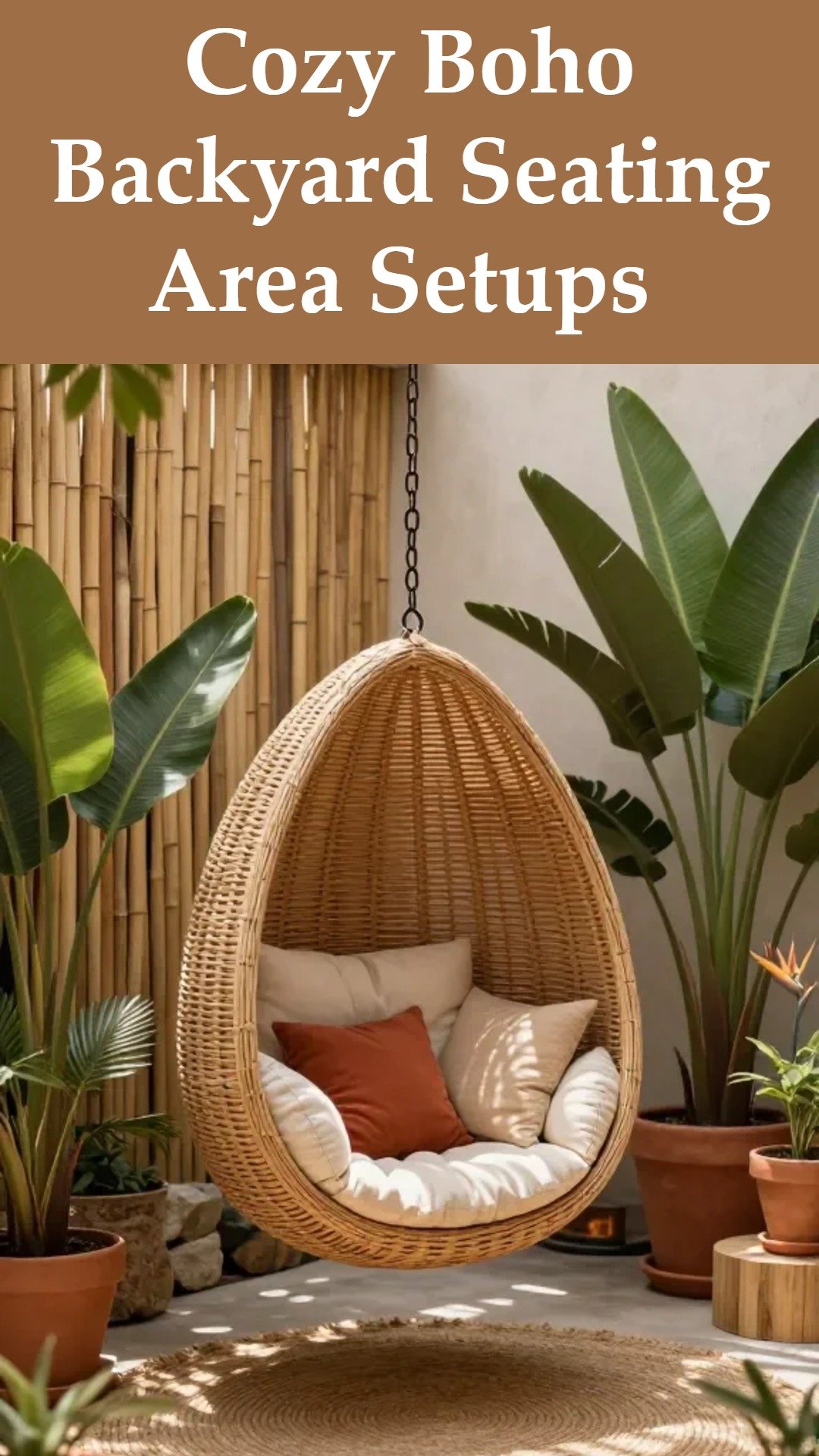 7 Boho Backyard Seating Areas with a Hanging Egg Chair, Clustered Solar Lanterns, Terra Cotta Pots with Tropical Plants, a Rattan Outdoor Sofa, a Jute Outdoor Rug, a Bamboo Privacy Screen, and a Stone Fire Pit Glow Up