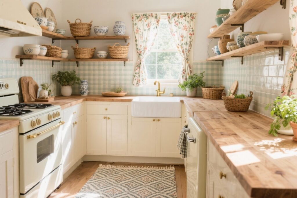 - Backsplash: Try beadboard, subway tile, or tiny floral tiles for instant cottage vibes.