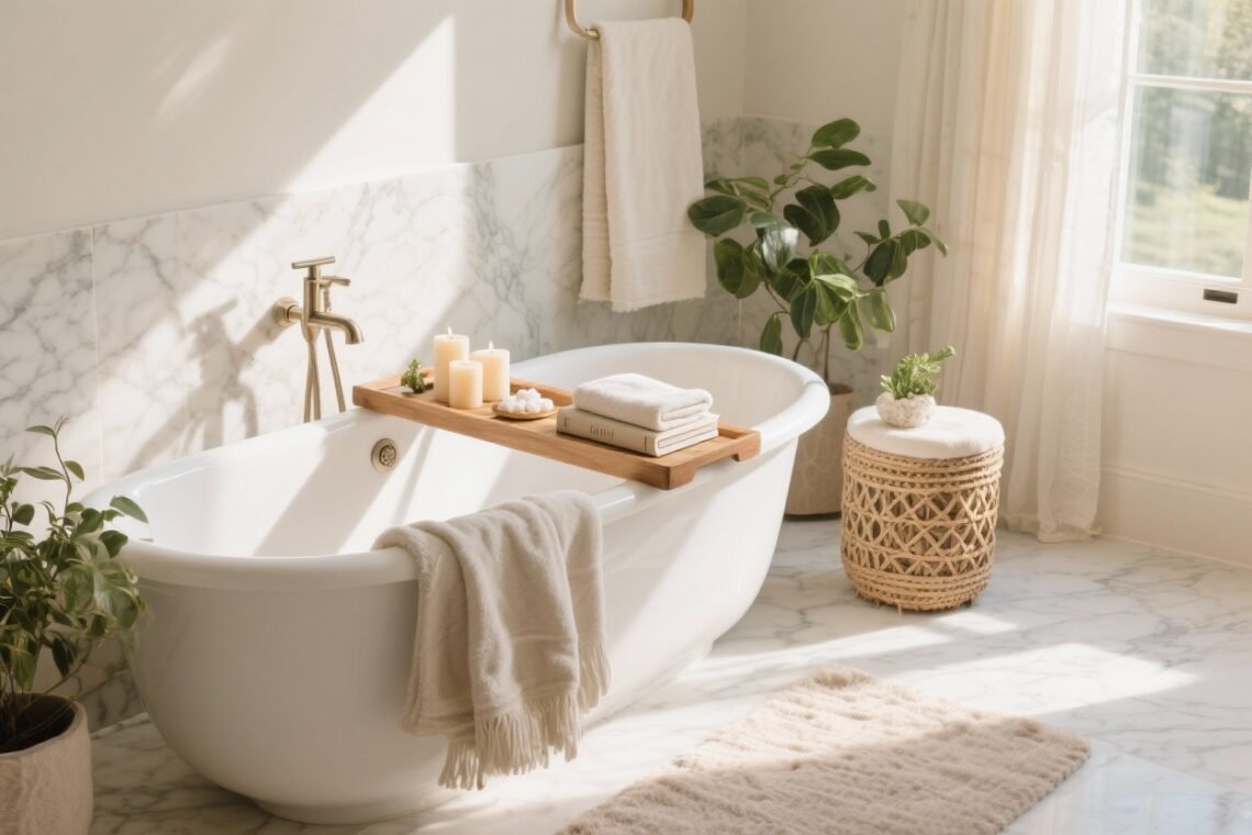 Ready to soak like a pro? Start with the bathtub tray, layer in scent and lighting, then finish with plush textiles and smart storage. With just a few thoughtful swaps, your bathroom goes from “meh” to “meet me at the spa” in no time. Light the candle, press play, and enjoy your very best cozy bath ritual tonight.