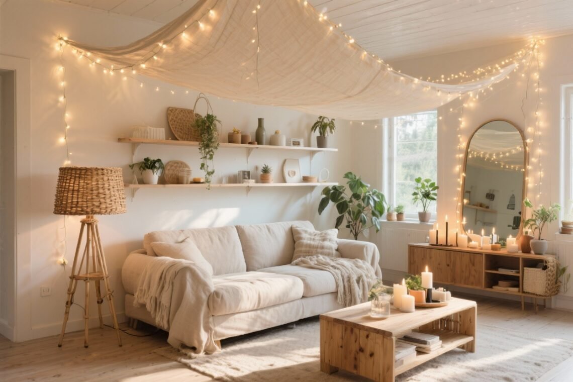 Want instant ambiance? Hang curtain-style fairy lights behind sheer drapes or across a blank wall. The glow diffuses through the fabric, creating that dreamy, soft-focus vibe you see in boutique hotels.