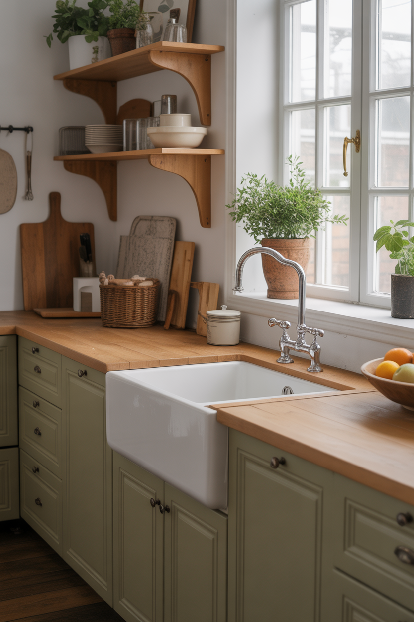 - Apron-front sink: Fireclay or cast iron works best for that classic, chunky profile.