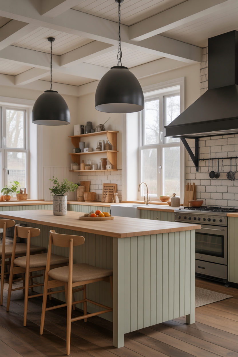 - Pendants over the island: Schoolhouse glass, barn-style shades, or simple metal domes.
