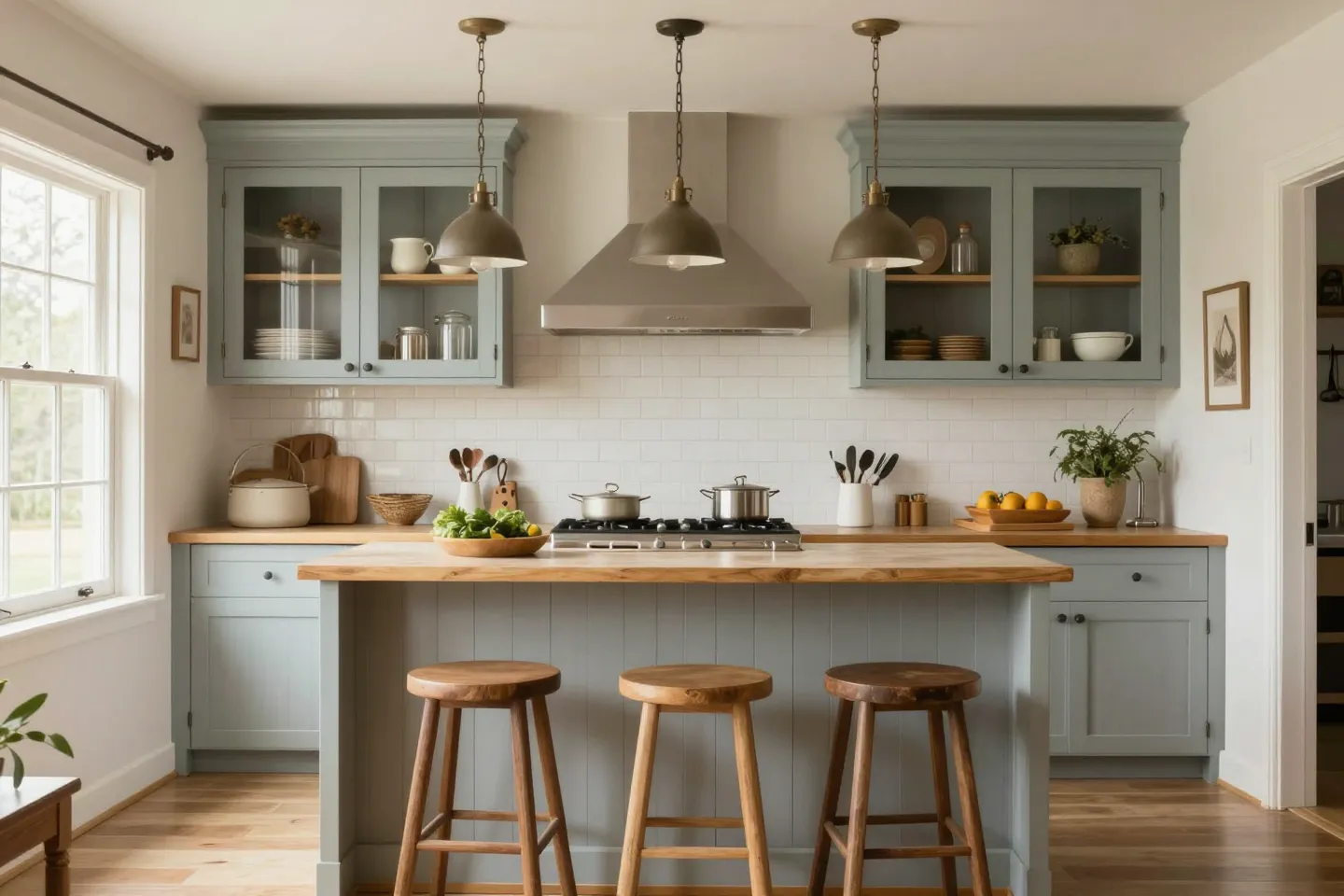 - Pendants over the island: Schoolhouse glass, barn-style shades, or simple metal domes.