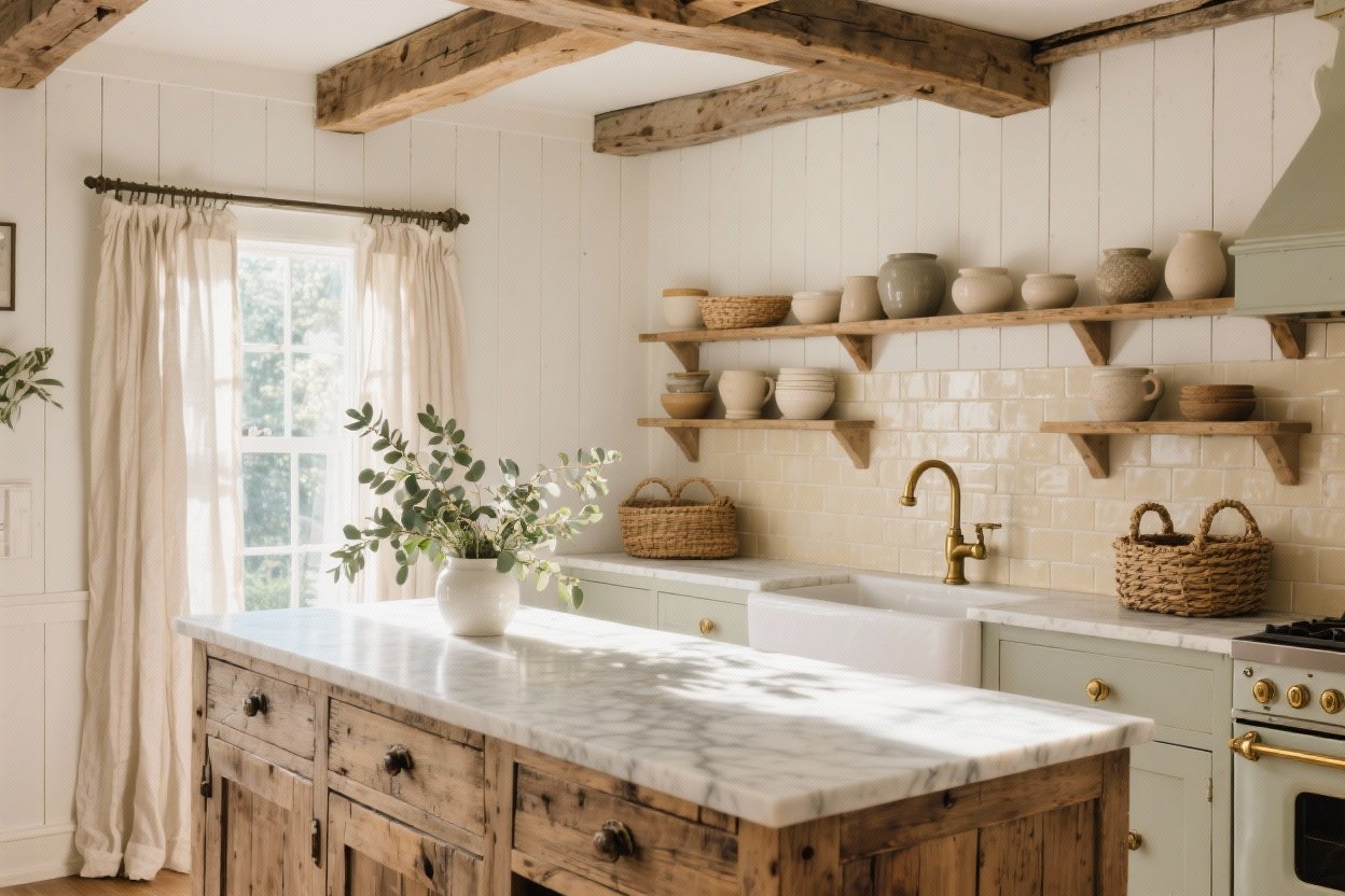 - Wood Accents: Butcher block, open shelves, or an antique farmhouse table.