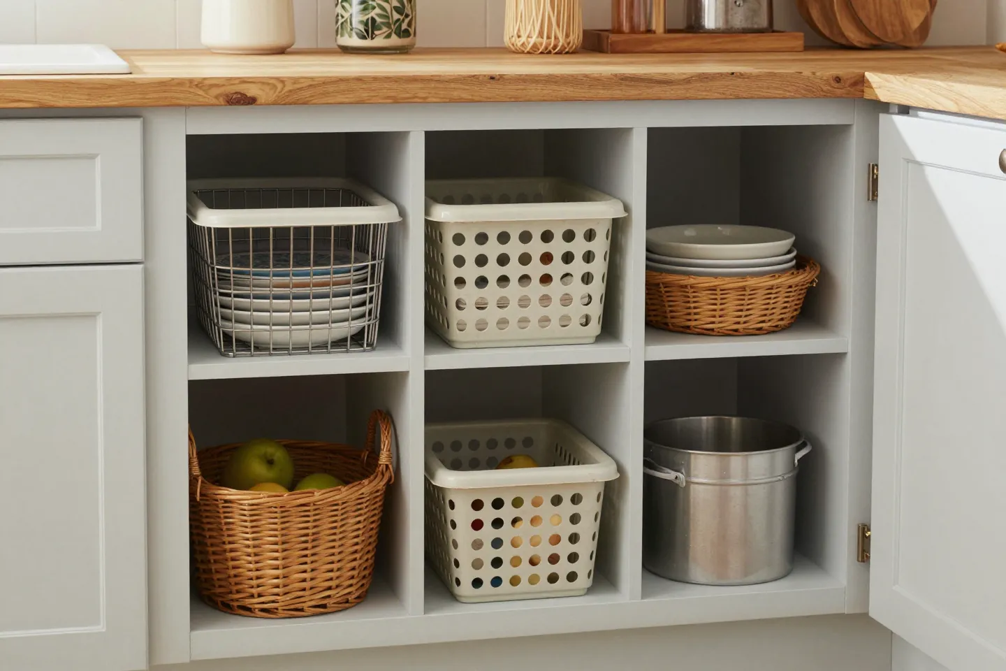 - Woven baskets for larger items. Tuck away towels, lunchboxes, or small appliances you don’t use daily.