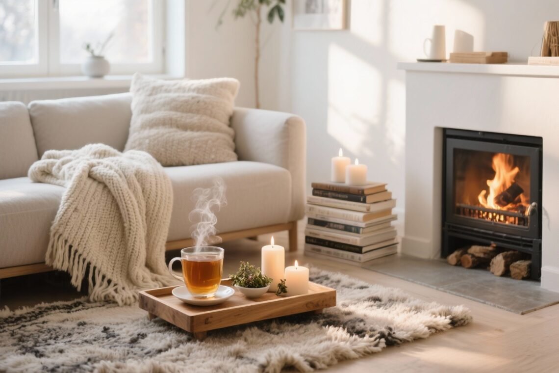 - Weekly: One cozy reset hour: wash throws, refresh flowers/greens, clear surfaces, restock your drink station.