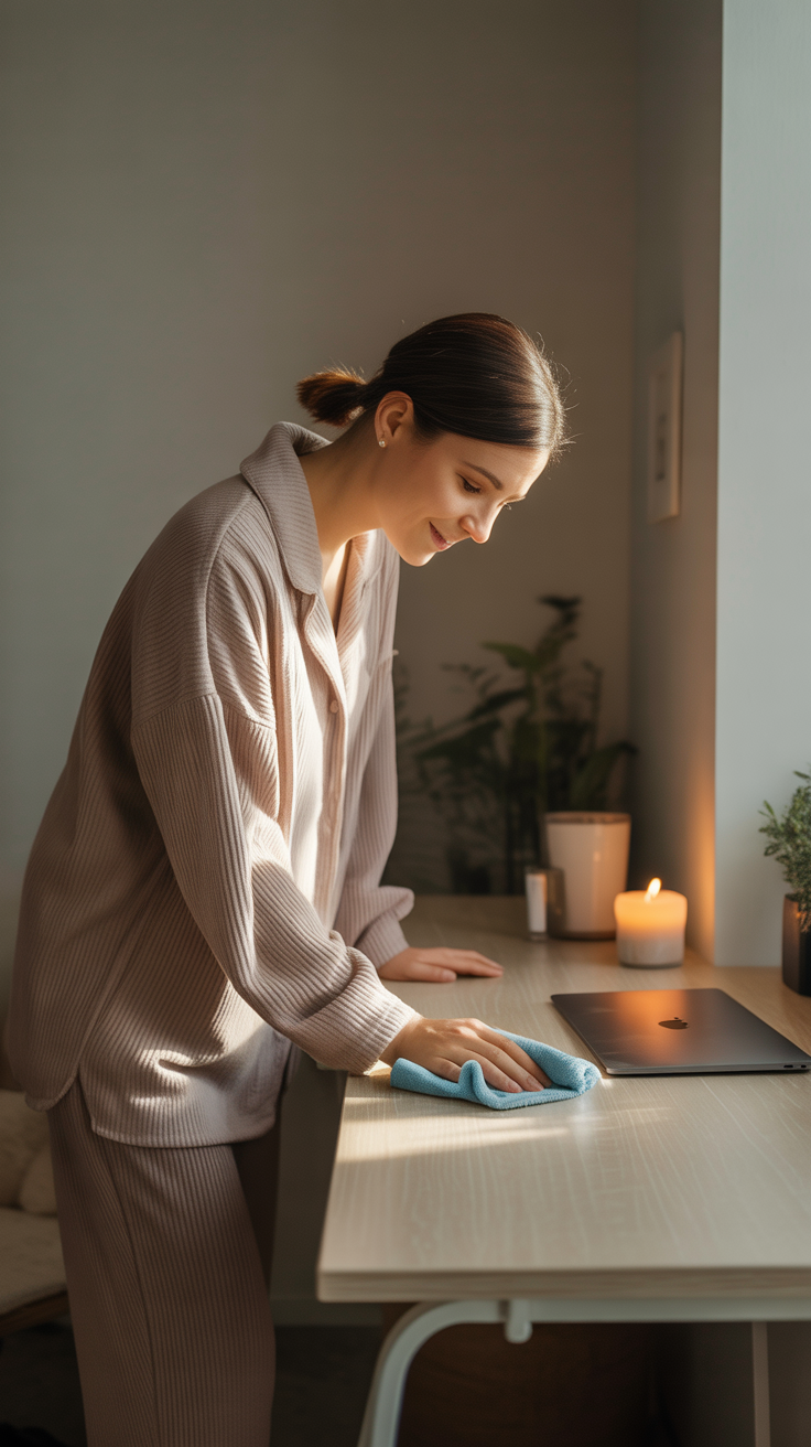 - Reset surfaces: Clear your desk, nightstand, kitchen counter. Wipe them down. Admire the silence.