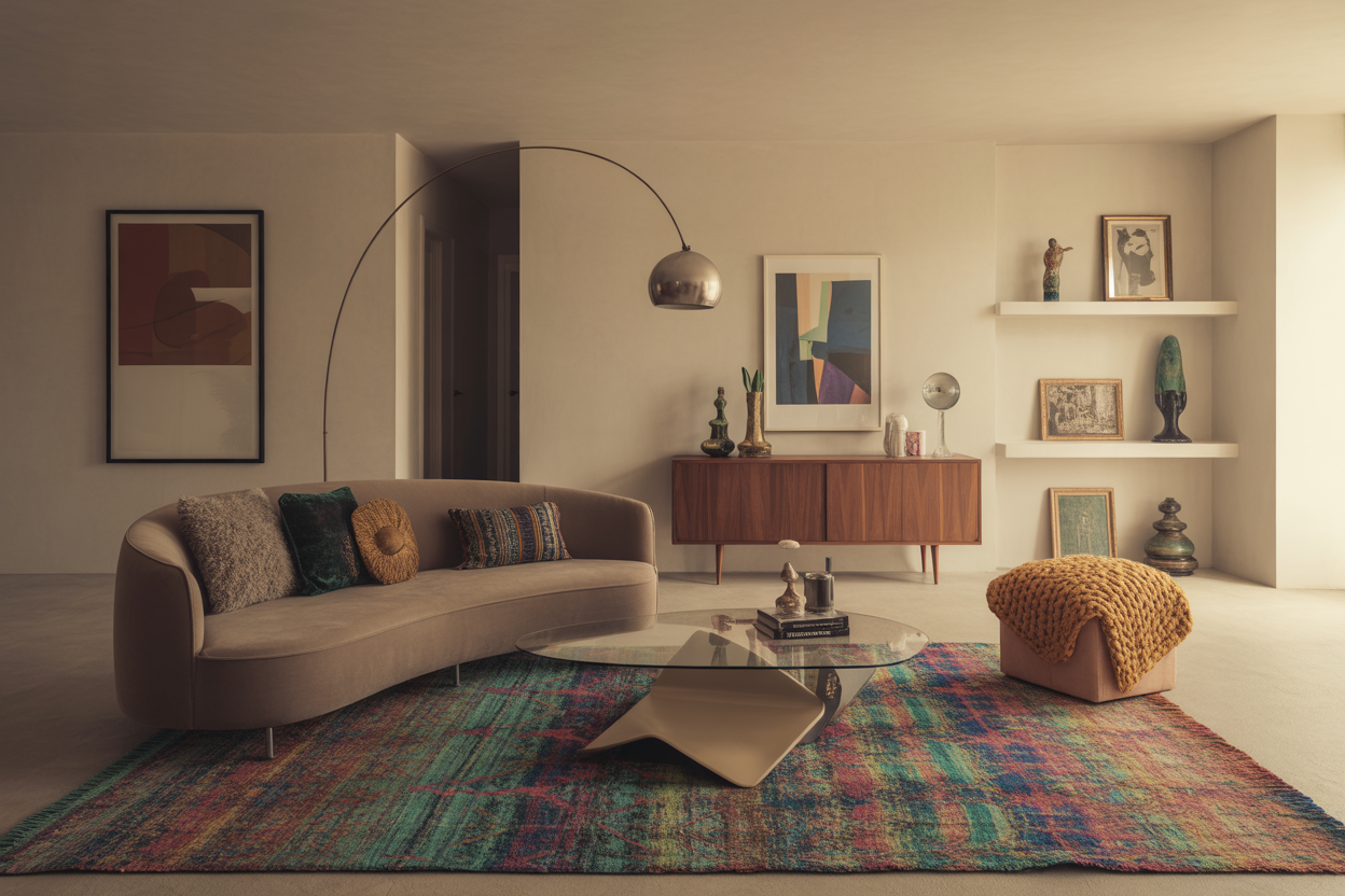 - Modern: This is the grounding element. To keep the room from looking like a flea market explosion, we use modern silhouettes—sleek sofas, geometric coffee tables, and contemporary art—to provide a resting place for the eye.
