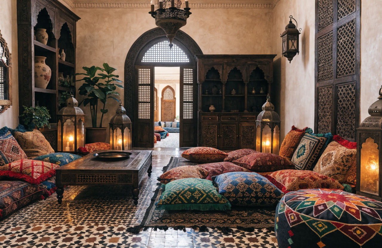 Start with a traditional Beni Ourain rug or a colorful Berber rug as your foundation. These handwoven beauties add texture and warmth while grounding your space. Then pile on embroidered pillows, silk cushions, and woven poufs until your seating area looks like the coziest spot on earth.