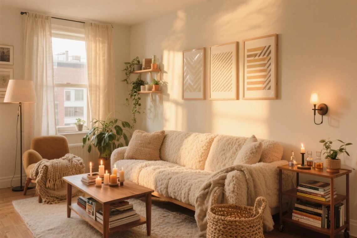 You don’t need a fireplace or a cabin in Denmark to nail cozy vibes. You just need a little strategy, a few soft textures, and lighting that flatters you like a rom‑com’s golden hour. Consider this your cheat sheet for turning your apartment into a hygge haven—totally renter‑approved, totally main‑character energy. 1. Set the Scene With Cozy, Layered Lighting Overhead lights? Harsh. For hygge, you want glowy, flattering pools of light that make you look like you have your life together. Think three to five small light sources instead of one blinding ceiling light. What to Use Plug‑in sconces with…