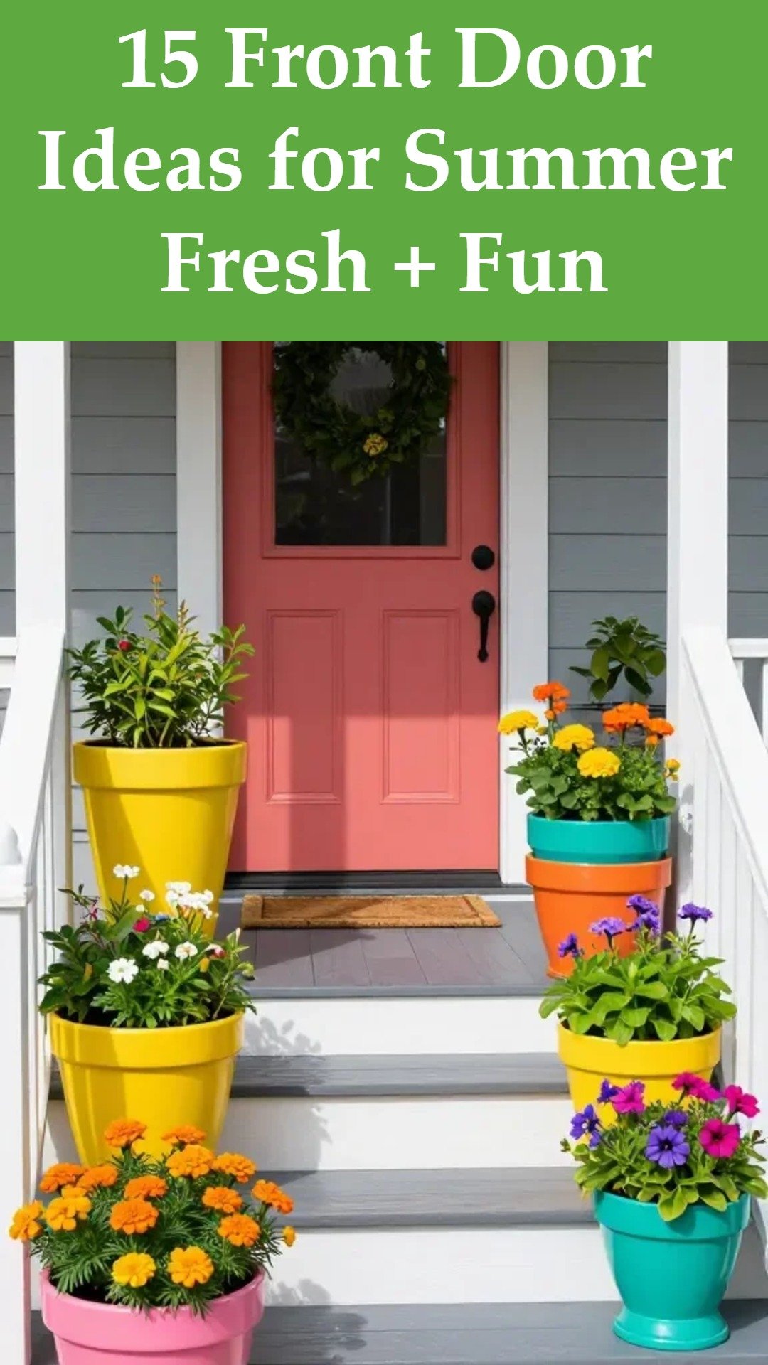 These ideas blend sun-friendly vibes with earthy textures, giving your entryway instant charm. From faux wildflowers to solar lanterns, you’ll love greeting guests with a warm, rustic welcome. FYI, this is the glow-up your front door deserves. UV-Resistant Wildflower Wreath + Layered Doormat Ensemble Kick things off with a wreath that can handle summer weather without wilting. A UV-resistant faux wildflower wreath brings breezy color while the layered doormat set adds instant depth underfoot. Serious curb appeal, no maintenance drama. What makes it awesome Bright, year-round floral splash that never fades Textural contrast between a poly rug and natural coir…