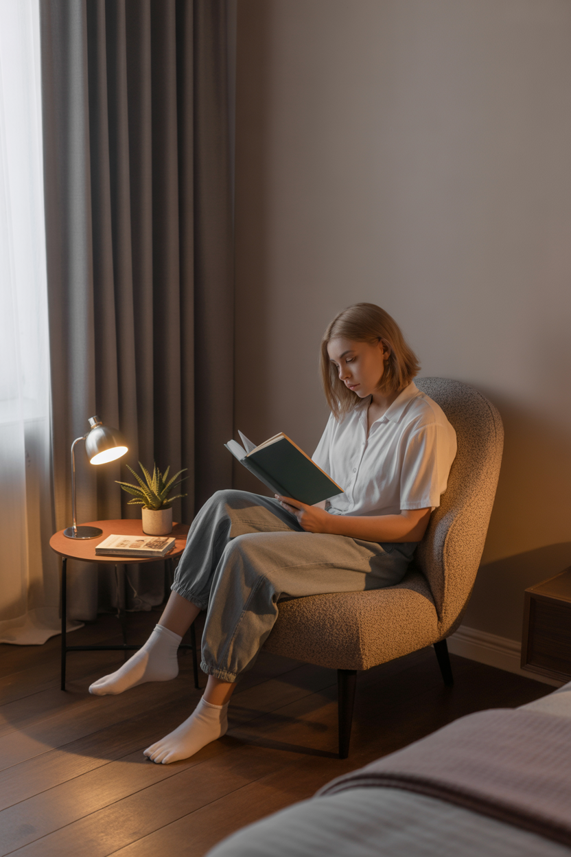 Create a ritual: lamp on, headphones in, curtain or screen pulled, mug placed. That sequence signals “reading hour.” Keep everything portable so you can pack it away quickly if needed.