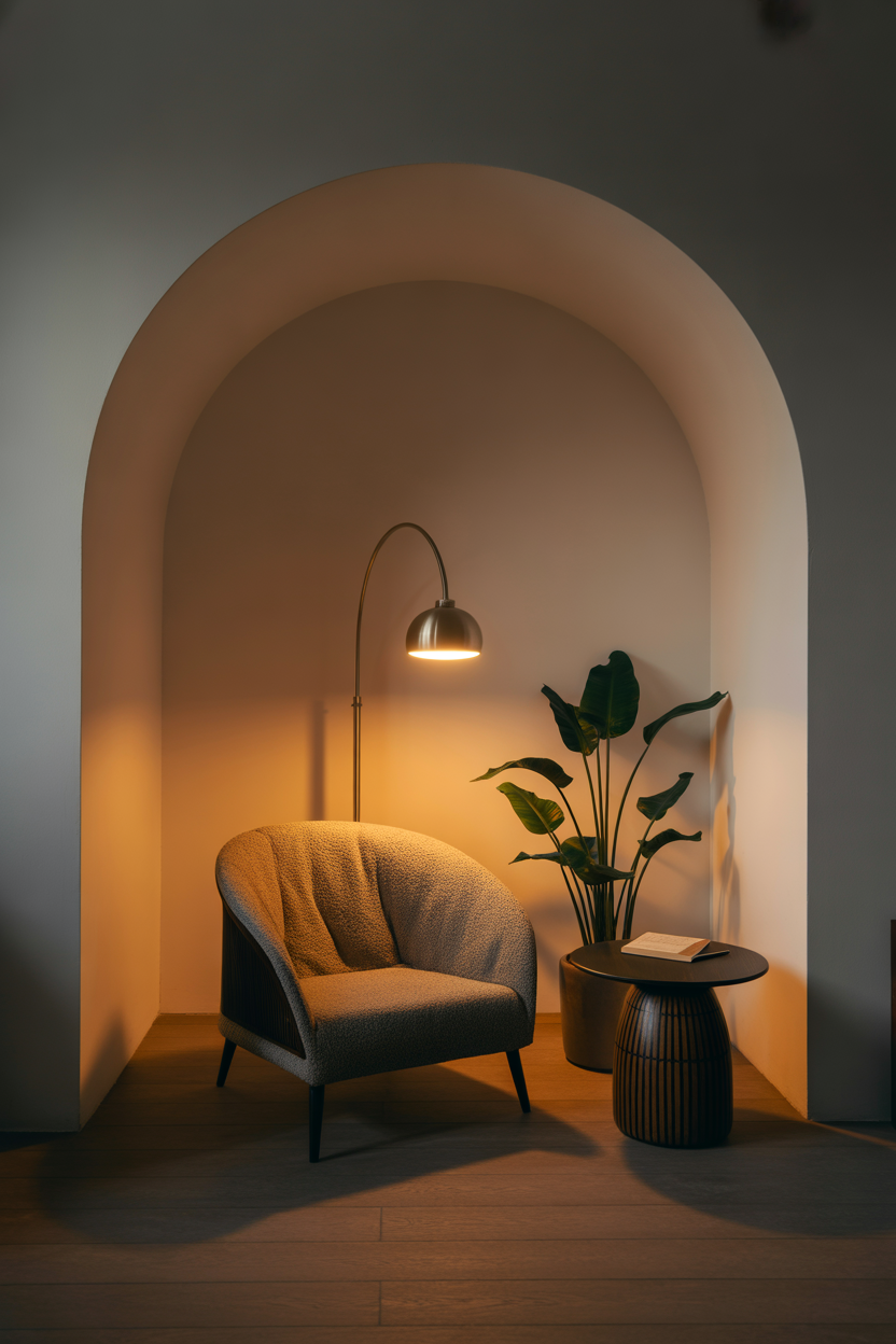 - Bedroom corner: Petite armchair + round table + plug-in sconce above the shoulder.