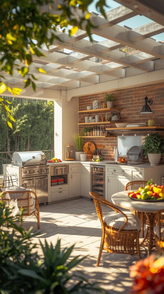 Include thoughtful touches like built-in storage, spice racks, and an outdoor sink that make cooking feel effortless. Pergolas or awnings keep you comfortable no matter the weather, while beautiful lighting extends the magic well into the evening.